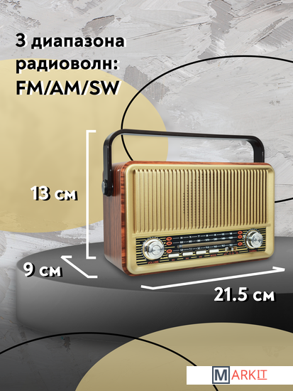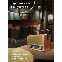 Радиоприемник MIRU SR-1028 коричневого цвета имеет ретро дизайн, простой функционал и обеспечивает приём сигналов в диапазоне FM, AM и SW. Аналоговый способ настройки частоты предполагает более точное и быстрое улавливание нужного канала. Для улучшения качества сигнала у радиоприемника имеется поворотная телескопическая антенна. Радиоприемник SR-1028 может работать как от сети 220В, так и аккумулятора. Устройство оснащено удобной, складывающейся ручкой, благодаря чему его будет легко переносить. Органы регулировки громкость и смена диапазонов расположенны на передней панели приемника. Также предусмотрено проигрывание с USB и microSD накопителей. Данный радиоприемник отлично подойдет для туристов, дачников и просто любителей отдыха на природе
